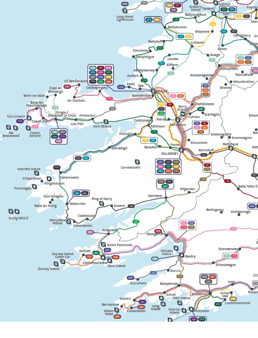 The excellent Kerry route map showing TFI Local Link Kerry Regular Rural Services (RRS) and Bus Éireann bus routes throughout Co. Kerry is well worth looking at to see the extensive network of services which can now be accessed throughout the county.